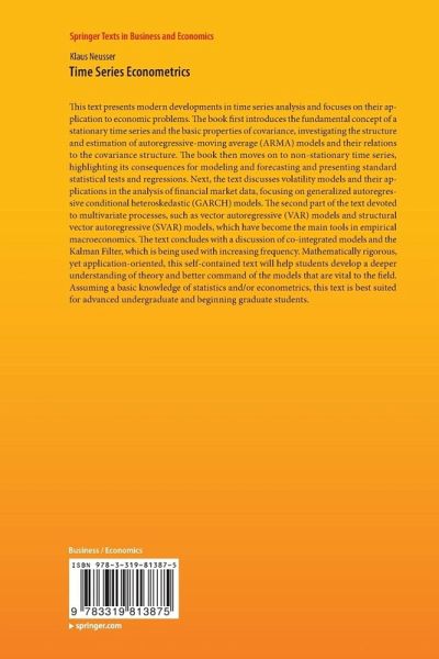 This text presents modern developments in time series analysis and focuses on their application to economic problems. The book first introduces the fundamental concept of a stationary time series and the basic properties of covariance, investigating the structure and estimation of autoregressive-moving average (ARMA) models and their relations to the covariance structure. The book then moves on to non-stationary time series, highlighting its consequences for modeling and forecasting and presenting standard statistical tests and regressions. Next, the text discusses volatility models and their applications in the analysis of financial market data, focusing on generalized autoregressive conditional heteroskedastic (GARCH) models. The second part of the text devoted to multivariate processes, such as vector autoregressive (VAR) models and structural vector autoregressive (SVAR) models, which have become the main tools in empirical macroeconomics. The text concludes with a discussionof co-integrated models and the Kalman Filter, which is being used with increasing frequency. Mathematically rigorous, yet application-oriented, this self-contained text will help students develop a deeper understanding of theory and better command of the models that are vital to the field. Assuming a basic knowledge of statistics and/or econometrics, this text is best suited for advanced undergraduate and beginning graduate students.