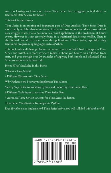 Are you looking to learn more about Time Series, but struggling to find them in traditional Data Science textbooks? This book is your answer. Time Series is an exciting and important part of Data Analysis. Time Series Data is more readily available than most forms of data and answers questions that cross-sectional data struggle to do. It also has more real world application in the prediction of future events. However it is not generally found in a traditional data science toolkit. There is also limited centralized resources on the applications of Time Series, especially using traditional programming languages such as Python. This book solves all these problems, and more. It starts off with basic concepts in Time Series, and switches to more advanced topics. It shows you how to set up Python from start, and goes through over 20 examples of applying both simple and advanced Time Series concepts with Python code. Here's What's Included In this Book: What is a Time Series? 4 Different Elements of a Time Series Why Python is the best way to Implement Time Series Step by Step Guide to Installing Python and Importing Time Series Data 6 Different Techniques to Analyze Time Series Data 3 Advanced Time Series Concepts for Time Series Prediction Time Series Visualization Techniques in Python Even if you've never implemented Time Series before, you will still find this book useful.