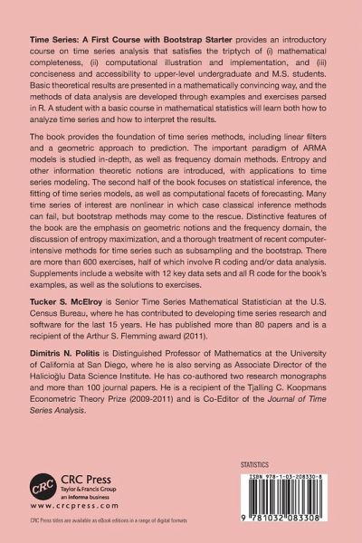 Time Series: A First Course with Bootstrap Starter provides an introductory course on time series analysis that satisfies the triptych of (i) mathematical completeness, (ii) computational illustration and implementation, and (iii) conciseness and accessibility to upper-level undergraduate and M.S. students. Basic theoretical results are presented in a mathematically convincing way, and the methods of data analysis are developed through examples and exercises parsed in R. A student with a basic course in mathematical statistics will learn both how to analyze time series and how to interpret the results.