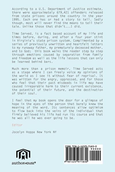 Time Served, is a fact based account of my life and times before, during, and after a four year stint in Virginia's state prison system. Complimented by a series of previously unwritten and heartfelt letters to my runaway father, my prematurely deceased mother, and to God; this book walks the reader step by step through emotions caused by separation from family and freedom as well as the life lessons that can only be learned behind bars.