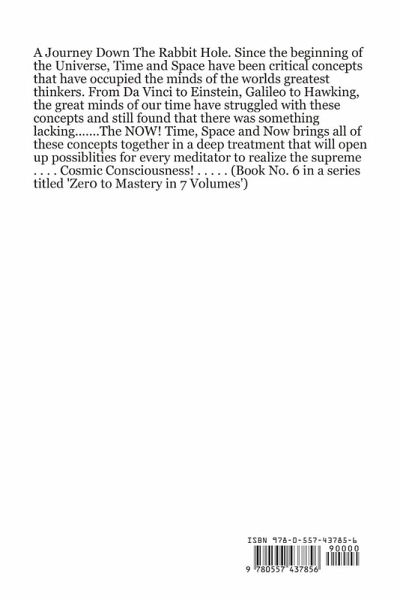 A Journey Down The Rabbit Hole. Since the beginning of the Universe, Time and Space have been critical concepts that have occupied the minds of the worlds greatest thinkers. From Da Vinci to Einstein, Galileo to Hawking, the great minds of our time have struggled with these concepts and still found that there was something lacking.......The NOW! Time, Space and Now brings all of these concepts together in a deep treatment that will open up possibilities for every meditator to realize the supreme . . . . Cosmic Consciousness! . . . . . (Book No. 6 in a series titled 'Zer0 to Mastery in 7 Volumes')