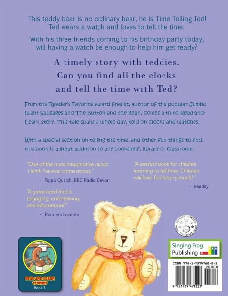 This teddy bear is no ordinary bear, he is Time Telling Ted! Ted wears a watch and loves to tell the time. With his three friends Lucy, Fred and Junior coming to his birthday party today, will having a watch be enough to help him get ready? A timely story about teds! Can you find all the clocks on each page and tell the time with Ted? From the Reader's Favorite award finalist, author of the popular Jumbo Giant Sausages and The Button and the Bean, comes a third 'read-and-learn' story that spans Ted's day, featuring the time on clocks and watches. With a special section on telling the time at the back of the book, plus other fun things to find in the story, this book is a great addition to any bookshelf, library or classroom!