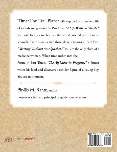 Time:The Trail Blazer will leap back in time to a life of sounds and gestures. In Part One, "A Life Without Words," you will face a cave bear as the world around you is in an ice-melt. Time blazes a trail through generations in Part Two, "Writing Without An Alphabet." You are the only child of a medicine woman. When time rushes into the future in Part Three, "The Alphabet in Progress," a farmer works his land and discovers a slender figure of a young boy. You are not human.