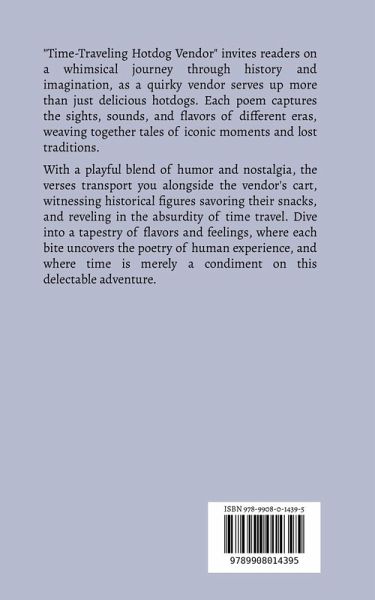 "Time-Traveling Hotdog Vendor" invites readers on a whimsical journey through history and imagination, as a quirky vendor serves up more than just delicious hotdogs. Each poem captures the sights, sounds, and flavors of different eras, weaving together tales of iconic moments and lost traditions. With a playful blend of humor and nostalgia, the verses transport you alongside the vendor's cart, witnessing historical figures savoring their snacks, and reveling in the absurdity of time travel. Dive into a tapestry of flavors and feelings, where each bite uncovers the poetry of human experience, and where time is merely a condiment on this delectable adventure.