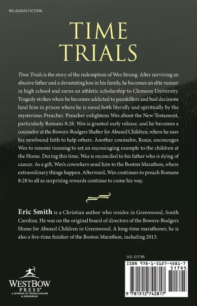 Time Trials is the story of the redemption of Wes Strong. After surviving an abusive father and a devastating loss in his family, he becomes an elite runner in high school and earns an athletic scholarship to Clemson University. Tragedy strikes when he becomes addicted to painkillers and bad decisions land him in prison where he is saved both literally and spiritually by the mysterious Preacher. Preacher enlightens Wes about the New Testament, particularly Romans 8:28. Wes is granted early release, and he becomes a counselor at the Bowers-Rodgers Shelter for Abused Children, where he uses his newfound faith to help others. Another counselor, Roxie, encourages Wes to resume running to set an encouraging example to the children at the Home. During this time, Wes is reconciled to his father who is dying of cancer. As a gift, Wes's coworkers send him to the Boston Marathon, where extraordinary things happen. Afterward, Wes continues to preach Romans 8:28 to all as surprising rewards continue to come his way.