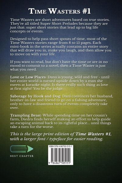 Time Wasters are short adventures based on true stories. They're all titled Super Short Preludes because they are just that: super short stories that lead up to big life concepts or events. Designed to help pass short spouts of time, most of the Time Wasters stories range from 8 to 15 pages. Each mini-book in the series actually contains an entire story that will draw you in, make you laugh, and then allow you to move on with your life. If you want to read, but don't have the time or are in no mood to commit to a novel, then a Time Waster is just what you need. Love or Low Places: Dana is young, wild and free - until her entire world is turned upside down by a man she meets at karaoke night. Is there really such thing as love at first sight? You be the judge. Sabotage by Hook and Dog: Dani convinces her husband, brother-in-law and friend to go on a fishing adventure, only to have a disastrous turn of events completely take over. Trampling Beast: While spending time on her cousin's farm, Diedra finds herself making an effort to help guide an escaping animal back to its rightful place... until things take a turn for the worse. This is the large print edition of Time Wasters, with a larger font / typeface for easier reading.