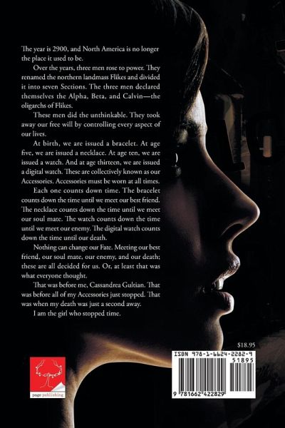 The year is 2900, and North America is no longer the place it used to be. Over the years, three men rose to power. They renamed the northern landmass Flikes and divided it into seven Sections. The three men declared themselves the Alpha, Beta, and Calvin-the oligarchs of Flikes. These men did the unthinkable. They took away our free will by controlling every aspect of our lives. At birth, we are issued a bracelet. At age five, we are issued a necklace. At age ten, we are issued a watch. And at age thirteen, we are issued a digital watch. These are collectively known as our Accessories. Accessories must be worn at all times. Each one counts down time. The bracelet counts down the time until we meet our best friend. The necklace counts down the time until we meet our soul mate. The watch counts down the time until we meet our enemy. The digital watch counts down the time until our death. Nothing can change our Fate. Meeting our best friend, our soul mate, our enemy, and our death; these are all decided for us. Or, at least that was what everyone thought. That was before me, Cassandrea Gultian. That was before all of my Accessories just stopped. That was when my death was just a second away. I am the girl who stopped time.