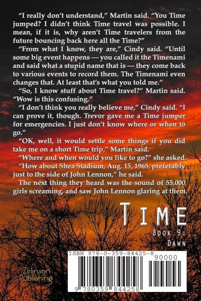 "I really don't understand," Martin said. "You Time jumped? I didn't think Time travel was possible. I mean, if it is, why aren't Time travelers from the future bouncing back here all the Time?" "From what I know, they are," Cindy said. "Until some big event happens - you called it the Timenami and said what a stupid name that is - they come back to various events to record them. The Timenami even changes that. At least that's what you told me." "So, I know stuff about Time travel?" Martin said. "Wow is this confusing." "I don't think you really believe me," Cindy said. "I can prove it, though. Trevor gave me a Time jumper for emergencies. I just don't know where or when to go." "OK, well, it would settle some things if you did take me on a short Time trip," Martin said. "Where and when would you like to go?" she asked. "How about Shea Stadium, Aug. 15, 1965, preferably just to the side of John Lennon," he said. The next thing they heard was 55,000 girls screaming, and saw John Lennon glaring at them.