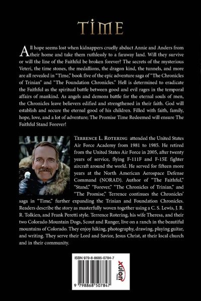 All hope seems lost when kidnappers cruelly abduct Annie and Anders from their home and take them ruthlessly to a faraway land. Will they survive or will the line of the Faithful be broken forever? The secrets of the mysterious Veteri, the time stones, the medallions, the dragon kind, the tunnels, and more are all revealed in "Time," book five of the epic adventure saga of "The Chronicles of Trinian" and "The Foundation Chronicles." Hell is determined to eradicate the Faithful as the spiritual battle between good and evil rages in the temporal affairs of mankind. As angels and demons battle for the eternal souls of men, the Chronicles leave believers edified and strengthened in their faith. God will establish and secure the eternal good of his children. Filled with faith, family, hope, love, and a lot of adventure; The Promise Time Redeemed will ensure The Faithful Stand Forever! Terrence L. Rotering attended the United States Air Force Academy from 1981 to 1985. He retired from the United States Air Force in 2005, after twenty years of service, flying F-111F and F-15E fighter aircraft around the world. He served for fifteen more years at the North American Aerospace Defense Command (NORAD). Author of "The Faithful," "Stand," "Forever," "The Chronicles of Trinian," and "The Promise," Terrence continues the Chronicles' saga in "Time," further expanding the Trinian and Foundation Chronicles. Readers describe the story as masterfully woven together using a C. S. Lewis, J. R. R. Tolkien, and Frank Peretti style. Terrence Rotering, his wife Theresa, and their two Colorado Mountain Dogs, Scout and Ranger, live on a ranch in the beautiful mountains of Colorado. They enjoy hiking, photography, drawing, playing guitar, and writing. They serve their Lord and Savior, Jesus Christ, at their local church and in their community.