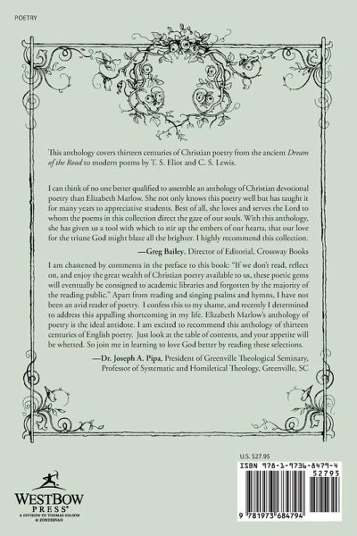 This anthology covers thirteen centuries of Christian poetry from the ancient Dream of the Rood to modern poems by T. S. Eliot and C. S. Lewis. I can think of no one better qualified to assemble an anthology of Christian devotional poetry than Elizabeth Marlow. She not only knows this poetry well but has taught it for many years to appreciative students. Best of all, she loves and serves the Lord to whom the poems in this collection direct the gaze of our souls. With this anthology, she has given us a tool with which to stir up the embers of our hearts, that our love for the triune God might blaze all the brighter. I highly recommend this collection. -Greg Bailey, Director of Editorial, Crossway Books I am chastened by comments in the preface to this book: "If we don't read, reflect on, and enjoy the great wealth of Christian poetry available to us, these poetic gems will eventually be consigned to academic libraries and forgotten by the majority of the reading public." Apart from reading and singing psalms and hymns, I have not been an avid reader of poetry. I confess this to my shame, and recently I determined to address this appalling shortcoming in my life. Elizabeth Marlow's anthology of poetry is the ideal antidote. I am excited to recommend this anthology of thirteen centuries of English poetry. Just look at the table of contents, and your appetite will be whetted. So join me in learning to love God better by reading these selections. -Dr. Joseph A. Pipa, President of Greenville Theological Seminary, Professor of Systematic and Homiletical Theology, Greenville, SC