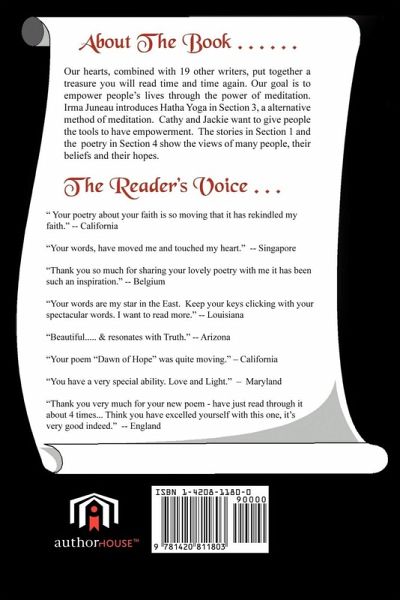 Our hearts, combined with 19 other writers, put together a treasure you will read time and time again. Our goal is to empower people's lives through the power of meditation. Irma Juneau introduces Hatha Yoga in Section 3, a alternative method of meditation. Cathy and Jackie want to give people the tools to have empowerment. The stories in Section 1 and the poetry in Section 4 show the views of many people, their beliefs and their hopes.