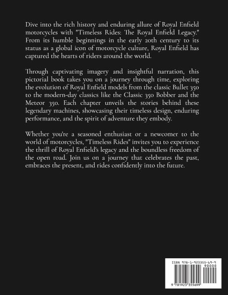 Dive into the rich history and enduring allure of Royal Enfield motorcycles with "Timeless Rides: The Royal Enfield Legacy." From its humble beginnings in the early 20th century to its status as a global icon of motorcycle culture, Royal Enfield has captured the hearts of riders around the world. Through captivating imagery and insightful narration, this pictorial book takes you on a journey through time, exploring the evolution of Royal Enfield models from the classic Bullet 350 to the modern-day classics like the Classic 350 Bobber and the Meteor 350. Each chapter unveils the stories behind these legendary machines, showcasing their timeless design, enduring performance, and the spirit of adventure they embody. Whether you're a seasoned enthusiast or a newcomer to the world of motorcycles, "Timeless Rides" invites you to experience the thrill of Royal Enfield's legacy and the boundless freedom of the open road. Join us on a journey that celebrates the past, embraces the present, and rides confidently into the future.