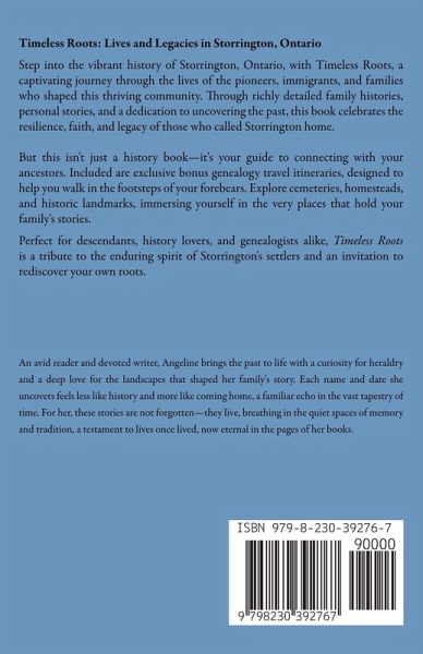 Timeless Roots: Lives and Legacies in Storrington, Ontario Step into the vibrant history of Storrington, Ontario, with Timeless Roots, a captivating journey through the lives of the pioneers, immigrants, and families who shaped this thriving community. Through richly detailed family histories, personal stories, and a dedication to uncovering the past, this book celebrates the resilience, faith, and legacy of those who called Storrington home. But this isn't just a history book-it's your guide to connecting with your ancestors. Included are exclusive bonus genealogy travel itineraries, designed to help you walk in the footsteps of your forebears. Explore cemeteries, homesteads, and historic landmarks, immersing yourself in the very places that hold your family's stories. Perfect for descendants, history lovers, and genealogists alike, Timeless Roots is a tribute to the enduring spirit of Storrington's settlers and an invitation to rediscover your own roots.