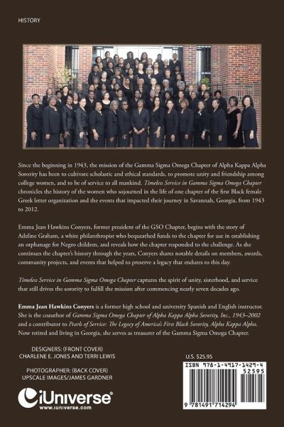Since the beginning in 1943, the mission of the Gamma Sigma Omega Chapter of Alpha Kappa Alpha Sorority has been to cultivate scholastic and ethical standards, to promote unity and friendship among college women, and to be of service to all mankind. Timeless Service in Gamma Sigma Omega Chapter chronicles the history of the women who sojourned in the life of one chapter of the first Black female Greek letter organization and the events that impacted their journey in Savannah, Georgia, from 1943 to 2012. Emma Jean Hawkins Conyers, former president of the GSO Chapter, begins with the story of Adeline Graham, a white philanthropist who bequeathed funds to the chapter for use in establishing an orphanage for Negro children, and reveals how the chapter responded to the challenge. As she continues the chapter's history through the years, Conyers shares notable details on members, awards, community projects, and events that helped to preserve a legacy that endures to this day. Timeless Service in Gamma Sigma Omega Chapter captures the spirit of unity, sisterhood, and service that still drives the sorority to fulfill the mission after commencing nearly seven decades ago.