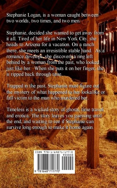 Stephanie Logan, is a woman caught between two worlds, two times, and two men. Stephanie, decided she wanted to get away from it all. Tired of her life in New York City, she heads to Arizona for a vacation. On a ranch there, she meets an irresistible stable hand. As a romance develops, she discovers a ring left behind by a woman from the past, who looked just like her. When she puts it on her finger, she is ripped back through time. Trapped in the past, Stephanie must figure out the mystery of what happened to her lookalike or fall victim to the man who murdered her. Timeless is a wicked story of ghosts, time travel and erotica. The story leaves you guessing until the end, and waiting to see if Stephanie can survive long enough to make it home again.