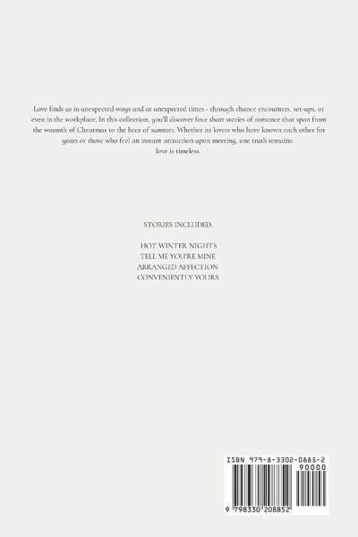 Love finds us in unexpected ways and at unexpected times-through chance encounters, set-ups, or even in the workplace. In this collection, you'll discover four short stories of romance that span from the warmth of Christmas to the heat of summer. Whether it's lovers who have known each other for years or those who feel an instant attraction upon meeting, one truth remains: love is timeless. STORIES INCLUDED: HOT WINTER NIGHTS TELL ME YOU'RE MINE ARRANGED AFFECTION CONVENIENTLY YOURS