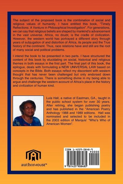 The subject of the proposed book is the combination of social and religious values of humanity. I have entitled this book, "Timely Reflections: A Venture in Philosophical Investigation". For generations, we can say that religious beliefs are shaped by mankind's advancement in the vast universe. Africa, no doubt, is the cradle of civilization. However, the western world has portrayed a different story through years of subjugation of and distortion of Africa, its people and the True history of the continent. Thus, race relations have and still are the root of many social and political problems. I intend the book to be presented in two parts. I have structured the content of this book by elucidating on social, historical and religious themes in both essays in the first part. The final part of this book, the epilogue, deals with formulating a NEW UNIVERSAL LAW based on concepts in the Bible. Both essays reflect my discontent with western thought that has never been challenged but only endorsed down through the centuries. There is something divine in my being able to argue and challenge the western account of Africa's place in the history and civilization of human kind. These essays are presented in a controversial manner to provoke intellectual discussion on the subject of race, world leadership and a spiritual universal phenomenon. I believe the essays would be the beginning of the solution of the race problem. The first essay discusses the correlation between race and power. The second essay is an exercise in intellectual curiosity dealing with a complex, abstract sensitive Christian concept-The Holy Trinity- with scientific analogy. The Holy Trinity is illustrated scientifically to explain the triune nature of the Creator. I intend to use this hook to discredit the western notion that the black race is a "cursed race". The western belief is contrary to many biblical inferences of black people in the Bible. The reason I believe that I am the best qualified person to