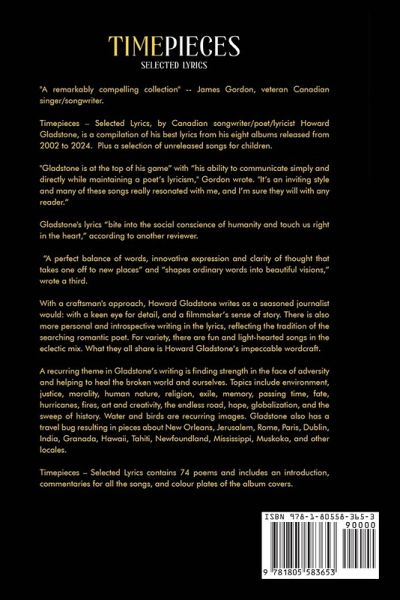 "A remarkably compelling collection" -- James Gordon, veteran Canadian singer/songwriter. Timepieces - Selected Lyrics, by Canadian songwriter/poet/lyricist Howard Gladstone, is a compilation of his best lyrics from his eight albums released from 2002 to 2024. "Gladstone is at the top of his game" with "his ability to communicate simply and directly while maintaining a poet's lyricism," Gordon wrote. "It's an inviting style and many of these songs really resonated with me, and I'm sure they will with any reader." Gladstone's lyrics "bite into the social conscience of humanity and touch us right in the heart," according to another reviewer. "A perfect balance of words, innovative expression and clarity of thought that takes one off to new places" and "shapes ordinary words into beautiful visions," wrote a third. With a craftsman's approach, Howard Gladstone writes as a seasoned journalist would: with a keen eye for detail, and a filmmaker's sense of story. There is also more personal and introspective writing in the lyrics, reflecting the tradition of the searching romantic poet. For variety, there are fun and light-hearted songs in the eclectic mix. What they all share is Howard Gladstone's impeccable wordcraft. A recurring theme in Gladstone's writing is finding strength in the face of adversity and helping to heal the broken world and ourselves. Topics include environment, justice, morality, human nature, religion, exile, memory, passing time, fate, hurricanes, fires, art and creativity, the endless road, hope, globalization, and the sweep of history. Water and birds are two examples of recurring images. Gladstone also has a travel bug resulting in pieces about New Orleans, Jerusalem, Rome, Paris, Dublin, India, Granada, Hawaii, Tahiti, Newfoundland, Mississippi, Muskoka, and other locales. Howard Gladstone's influences are clear to see - Bob Dylan and Leonard Cohen would be the chief ones -and John Lennon, Joni Mitchell, Robbie Robertson at a second level - but his own song writing- tone and voice are now clearer than ever. Over the course of eight full-length recordings, he has developed significantly as a poet/composer, and the various strands of meaning - whether personal, poetic, political, prophetic- have become more profoundly interlinked. Why publish a book of lyrics? Lyrics can have the strength of poetry and carry emotion and meaning separately from the music. Reading the lyric allows the reader to focus on the wordcraft and artistry. Howard Gladstone has worked hard on these songs and readers, writers, and listeners have noticed. Timepieces - Selected Lyrics contains 74 works and includes an introduction, commentaries for all the songs, and colour plates of the eight album covers.