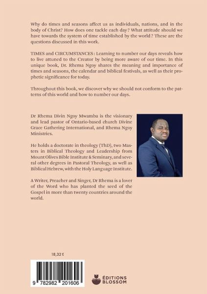 Why do times and seasons affect us as individuals, nations, and in the body of Christ? How does one tackle each day? What attitude should we have towards the system of time established by the world? These are the questions discussed in this work. TIMES and CIRCUMSTANCES: Learning to number our days reveals how to live attuned to the Creator by being more aware of our time. In this unique book, Dr. Rhema Ngoy shares the meaning and importance of times and seasons, the calendar, biblical festivals, and their prophetic significance for today. Throughout this book, we discover why we should not conform to the patterns of this world and how to number our days.