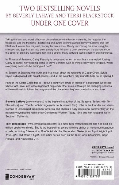 A compilation of two bestselling novels by Beverly LaHaye and Terri Blackstock come together under one cover. Fans of the Cedar Circle books---about a tightly knit circle of friends in a suburban cul-de-sac whose faith, love, and encouragement help each other make it through the changing seasons of life---will rush to follow the progress of the characters they've come to know and love. In Times and Seasons, Cathy Flaherty is devastated when her son Mark is arrested, forcing Cathy to cancel her wedding plans to Steve Bennett. Can all things really work for good, when everything seems to be turning out bad? In Season of Blessing, the fourth and final novel about the residents of Cedar Circle, Sylvia Bryan is diagnosed with breast cancer---and all the neighbors rally round to help her in fighting it.