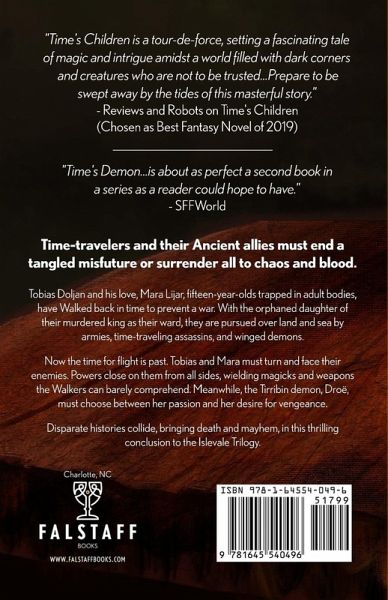 Time-travelers and their Ancient allies must end a tangled misfuture or surrender all to chaos and blood. Tobias Doljan and his love, Mara Lijar, fifteen-year-olds trapped in adult bodies, have Walked back in time to prevent a war. With the orphaned daughter of their murdered king as their ward, they are pursued over land and sea by armies, time-traveling assassins, and winged demons. Now the time for flight is past. Tobias and Mara must turn and face their enemies. Powers close on them from all sides, wielding magicks and weapons the Walkers can barely comprehend. Meanwhile, the Tirribin demon, Droë, must choose between her passion and her desire for vengeance. Disparate histories collide, bringing death and mayhem, in this thrilling conclusion to the Islevale Trilogy. Quotes: "This novel wields dueling timelines like knives." - Publisher's Weekly, starred review of Time's Children. "Time's Children is a tour-de-force, setting a fascinating tale of magic and intrigue amidst a world filled with dark corners and creatures who are not to be trusted...Prepare to be swept away by the tides of this masterful story." - Reviews and Robots on Time's Children (Chosen as Best Fantasy Novel of 2019) "Time's Demon...is about as perfect a second book in a series as a reader could hope to have." - SFFWorld