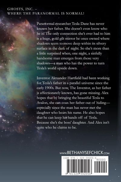 Ghosts, Inc. - where the paranormal is normal! Paranormal researcher Tesla Dane has never known her father. She doesn't even know who he is! The only connection she's ever had to him is a huge, gold gilt mirror he once owned where shadows seem to move deep within its silvery surface in the dark of night. So she's more than a little surprised when, one night, a sinfully handsome man emerges from those very shadows - a man who has the power to turn Tesla's world upside down. Inventor Alexander Hartfield had been working for Tesla's father in a parallel universe since the early 1900s. But now, The Inventor, as her father is affectionately known, has gone missing. Alex hopes that by bringing the beautiful Tesla to Avalon, she can coax her father out of hiding - especially since the man has never met the daughter who bears his name. He also hopes that he can keep his hands off of Tesla. Because she's the boss' daughter. And Alex isn't quite who he claims to be.