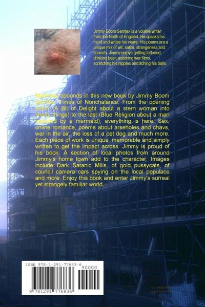 Madness abounds here. A stern woman into shady things, a man seduced by a mermaid, sex, online romance, buttholes and chavs, air war, loss of a pet dog and more. Each is unique and gets the impact across. A photo section adds character. Images include Dark Satanic Mills, gold pussycats and council camera cars spying on the local populace. Enjoy this book and enter Jimmy's surreal yet strangely familiar world. Example: JoJo A dog. A dog is never a dog. Never just a 'pet' or an 'animal' but a family member. A loved one. For many long years that love is shared.