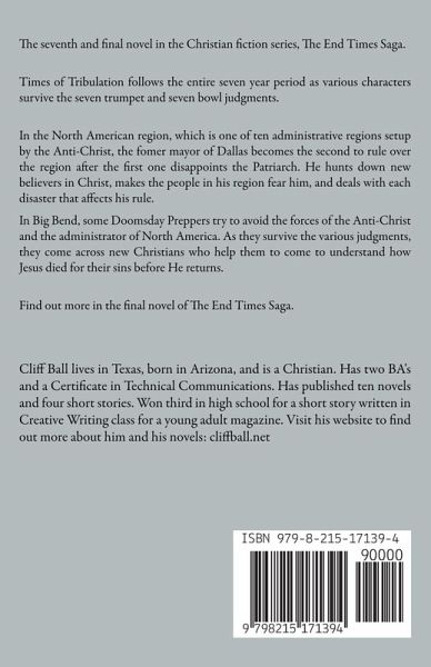 The seventh and final novel in the Christian fiction series, The End Times Saga. Times of Tribulation follows the entire seven year period as various characters survive the seven trumpet and seven bowl judgments. In the North American region, which is one of ten administrative regions setup by the Anti-Christ, the fomer mayor of Dallas becomes the second to rule over the region after the first one disappoints the Patriarch. He hunts down new believers in Christ, makes the people in his region fear him, and deals with each disaster that affects his rule. In Big Bend, some Doomsday Preppers try to avoid the forces of the Anti-Christ and the administrator of North America. As they survive the various judgments, they come across new Christians who help them to come to understand how Jesus died for their sins before He returns. Find out more in the final novel of The End Times Saga.