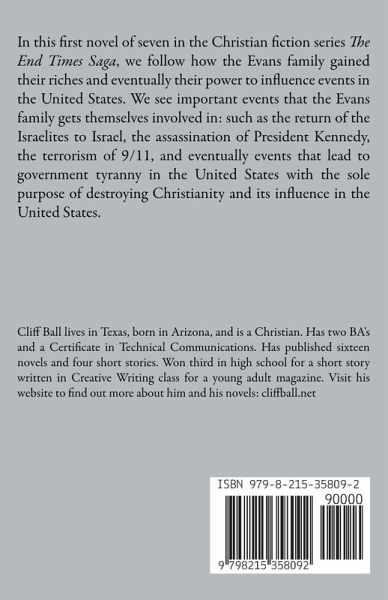 In this first novel of seven in the Christian fiction series The End Times Saga, we follow how the Evans family gained their riches and eventually their power to influence events in the United States. We see important events that the Evans family gets themselves involved in: such as the return of the Israelites to Israel, the assassination of President Kennedy, the terrorism of 9/11, and eventually events that lead to government tyranny in the United States with the sole purpose of destroying Christianity and its influence in the United States.