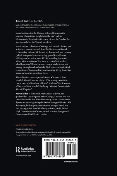 In earlier times, for the Chinese, Korea was 'the country of courteous people from the east', and for westerners 'the land of the morning calm' or 'hermit kingdom'. In this fascinating collection of writings on times past in Korea the author helps to lift the veil on this once closed country, providing the reader with a wide selection of first-hand accounts by travellers who 'discovered' Korea - some as snapshots by those passing through, others more detailed evaluations of Korean culture and everyday life by those who spent time there. The collection covers a period of over 400 years - from Hendrik Hamel's journal of the 1600s to early 20th century records, such as Roy C. Andrew's 1918 published account of his expedition, entitled Exploring Unknown Corners of the 'Hermit Kingdom'.