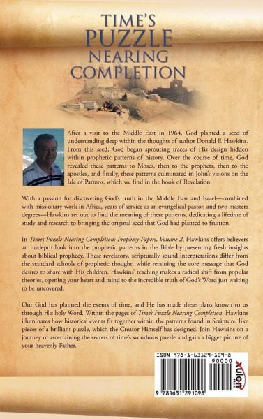 After a visit to the Middle East in 1964, God planted a seed of understanding deep within the thoughts of author Donald F. Hawkins. From this seed, God began sprouting traces of His design hidden within prophetic patterns of history. Over the course of time, God revealed these patterns to Moses, then to the prophets, then to the apostles, and finally, these patterns culminated in John's visions on the Isle of Patmos, which we find in the book of Revelation. With a passion for discovering God's truth in the Middle East and Israel--combined with missionary work in Africa, years of service as an evangelical pastor, and two masters degrees--Hawkins set out to find the meaning of these patterns, dedicating a lifetime of study and research to bringing the original seed that God had planted to fruition. In Time's Puzzle Nearing Completion: Prophecy Papers, Volume 2, Hawkins offers believers an in-depth look into the prophetic patterns in the Bible by presenting fresh insights about biblical prophecy. These revelatory, scripturally sound interpretations differ from the standard schools of prophetic thought, while retaining the core message that God desires to share with His children. Hawkins' teaching makes a radical shift from popular theories, opening your heart and mind to the incredible truth of God's Word just waiting to be uncovered. Our God has planned the events of time, and He has made these plans known to us through His holy Word. Within the pages of Time's Puzzle Nearing Completion, Hawkins illuminates how historical events fit together within the patterns found in Scripture, like pieces of a brilliant puzzle, which the Creator Himself has designed. Join Hawkins on a journey of ascertaining the secrets of time's wondrous puzzle and gain a bigger picture of your heavenly Father.