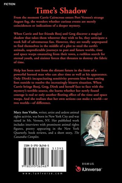 From the moment Carrie Cairncross enters Port Vernon's strange August fog, she wonders whether curious events are merely coincidences or indications of a deeper mystery. When Carrie and her friends Booj and Greg discover a magical shadow that takes them wherever they wish to be, they anticipate a week full of adventurous fun. However, they are totally unprepared to find themselves in the middle of a plot to steal the earth's animals, unpredictable journeys to past and future worlds, time and space warps emanating from their town, a ruthless search for eternal youth, and sinister forces that threaten to destroy the fabric of time. Help has been sent from the distant future in the form of a powerful horned man who can alter time as well as his appearance. Only Direk's incapacitating sensitivity prevents him from setting foot outside to resolve the increasingly bizarre situation. When Carrie brings Booj, Greg, Direk and herself face to face with the mystery's terrible source, she learns whether her newly found courage is real or only another fleeting effect of the time and space warps. And she realizes that her own actions can make a world-or two worlds-of difference.
