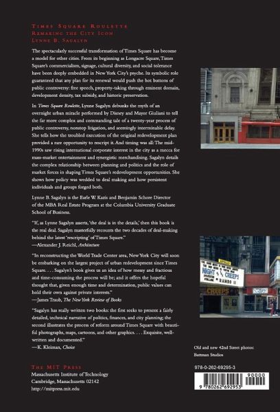 The compelling story of the politics, policies, and personalities that made Times Square's revitalization possible. The spectacularly successful transformation of Times Square has become a model for other cities. From its beginning as Longacre Square, Times Square's commercialism, signage, cultural diversity, and social tolerance have been deeply embedded in New York City's psyche. Its symbolic role guaranteed that any plan for its renewal would push the hot buttons of public controversy: free speech, property-taking through eminent domain, development density, tax subsidy, and historic preservation. In Times Square Roulette, Lynne Sagalyn debunks the myth of an overnight urban miracle performed by Disney and Mayor Giuliani, to tell the far more complex and commanding tale of a twenty-year process of public controversy, nonstop litigation, and interminable delay. She tells how the troubled execution of the original redevelopment plan provided a rare opportunity to rescript it. And timing was all: the mid-1990s saw rising international corporate interest in the city was a mecca for mass-market entertainment and synergistic merchandising. Sagalyn details the complex relationship between planning and politics and the role of market forces in shaping Times Square's redevelopment opportunities. She shows how policy was wedded to deal making and how persistent individuals and groups forged both.