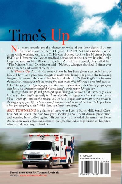 Not many people get the chance to write about their death. But Art Townsend is one of them. On June 11, 2009, Art had a sudden cardiac arrest while working out at the Y. He was shocked back to life 16 times by the EMTs and Emergency Room medical personnel at the nearby hospital, who fought to save his life. Weeks later, when Art left the hospital, they called him "The Miracle Man." One doctor said: "Nobody who gets shocked 16 times ever sits up in bed and walks these halls." In Time's Up, Art tells the story of how he has been given a second chance at life, and how God gave him the gift to really start living. Read the story of his death and learning what it means to live.