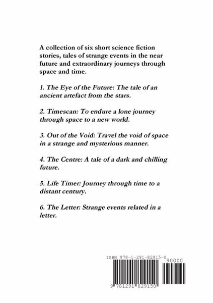 A collection of six short science fiction stories, tales of strange events in the near future and extraordinary journeys through space and time. 1. The Eye of the Future: The tale of an ancient artefact from the stars. 2. Timescan: To endure a lone journey through space to a new world. 3. Out of the Void: Travel the void of space in a strange and mysterious manner. 4. The Centre: A tale of a dark and chilling future. 5. Life Timer: Journey through time to a distant century. 6. The Letter: Strange events related in a letter.