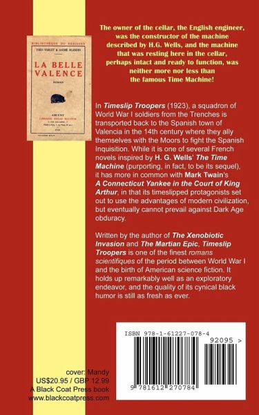 In Timeslip Troopers (1923), a squadron of World War I soldiers from the Trenches is transported back to the Spanish town of Valencia in the 14th century where they ally themselves with the Moors to fight the Spanish Inquisition. While it is one of several French novels inspired by H. G. Wells' The Time Machine -- purporting, in fact, to be its sequel -- it has more in common with Mark Twain's A Connecticut Yankee in the Court of King Arthur, in that its timeslipped protagonists set out to use the advantages of modern civilization, but eventually cannot prevail against Dark Age obduracy. Written by the author of The Xenobiotic Invasion and The Martian Epic, Timeslip Troopers is one of the finest romans scientifiques of the period between World War I and the birth of American science fiction. It holds up remarkably well as an exploratory endeavor, and the quality of its cynical black humor is still as fresh as ever.