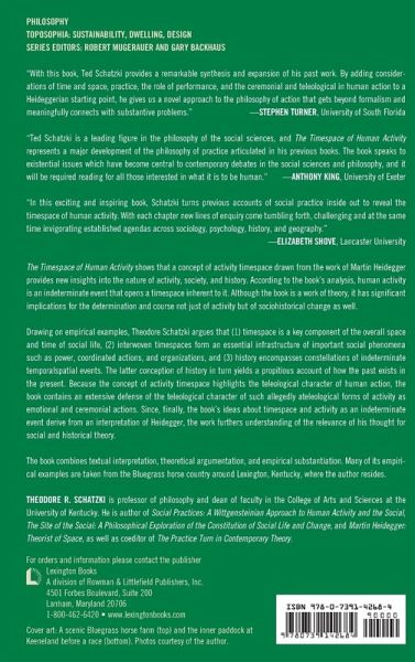 This book shows that a concept of activity timespace drawn from the work of Martin Heidegger provides new insights into the nature of activity, society, and history. Although the book is a work of theory, it has significant implications for the determination and course, not just of activity, but of sociohistorical change as well. Drawing on empirical examples, the book argues (1) that timespace is a key component of the overall space and time of social life, (2) that interwoven timespaces form an essential infrastructure of important social phenomena such as power, coordinated actions, social organizations, and social systems, and (3) that history encompasses constellations of indeterminate temporalspatial events. The latter conception of history in turn yields a propitious account of how the past exists in the present. In addition, because the concept of activity timespace highlights the teleological character of human action, the book contains an extensive defense of the teleological character of such allegedly ateleological forms of activity as emotional and ceremonial actions. Since, finally, the book's ideas about timespace and activity as an indeterminate event derive from an interpretation of Heidegger, the work furthers understanding of the relevance of his thought for social and historical theory. The book combines textual interpretation, theoretical argumentation, and empirical substantiation. Many of its empirical examples are taken from the Blue Grass Horse Country around Lexington, Kentucky, where the author resides.