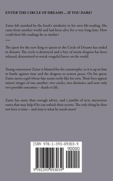ENTER THE CIRCLE OF DREAMS ... IF YOU DARE! Zaine felt numbed by the book's similarity to his own life-reading. She came from another world and had been alive for a very long time. How could their life-readings be so similar? **** The quest for the new king or queen in the Circle of Dreams has ended in disaster. The circle is destroyed and a fury of storm dragons has been released, determined to wreak vengeful havoc on the world. Young runeweaver Zaine is blamed for the catastrophe, so it is up to him to battle against time and the dragons to restore peace. On his quest, Zaine meets a girl whose fate seems eerily like his own. Their lives appear mirror images of one another: two circles, two destinies, and now only two possible outcomes - death or life. Zaine has more than enough advice, and a jumble of new, mysterious runes that may help if he can unlock their secrets. The only thing he does not have is time - and time is what he needs most!