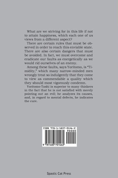 What are we striving for in this life if not to attain happiness, which each one of us views from a different aspect? There are certain rules that must be observed in order to reach this enviable state. There are also certain dangers that must be avoided. In fact, we must overcome and eradicate our faults as energetically as we would rid ourselves of an enemy. Among these faults, says Yoritomo, is "Timidity," which many narrow-minded men wrongly treat so indulgently that they come to view as commendable a quality which they should most vigorously condemn. Yoritomo-Tashi is superior to many thinkers in the fact that he is not satisfied with merely pointing out an evil; he analyzes its causes, and, in regard to mental defects, he indicates the cure.