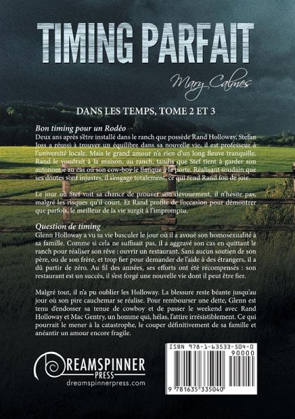 Dans les temps, tome 2 et 3 Bon timing pour un Rodéo Deux ans après s'être installé dans le ranch que possède Rand Holloway, Stefan Joss a réussi à trouver un équilibre dans sa nouvelle vie, il est professeur à l'université locale. Mais le grand amour n'a rien d'un long fleuve tranquille. Rand le voudrait à la maison, au ranch, tandis que Stef tient à garder son autonomie au cas où son cow-boy le flanque à la porte. Réalisant soudain que ses doutes sont injustes, il s'engage totalement, ce qui rend Rand fou de joie. Le jour où Stef voit sa chance de prouver son dévouement, il n'hésite pas, malgré les risques qu'il court. Et Rand profite de l'occasion pour démontrer que parfois, le meilleur de la vie surgit à l'impromptu. Question de timing Glenn Holloway a vu sa vie basculer le jour où il a avoué son homosexualité à sa famille. Comme si cela ne suffisait pas, il a aggravé son cas en quittant le ranch pour réaliser son rêve : ouvrir un restaurant. Sans aucun soutien de son père, ou de son frère, et trop fier pour demander de l'aide à des étrangers, il a dû partir de zéro. Au fil des années, ses efforts ont été récompensés : son restaurant est un succès, il s'est forgé une nouvelle vie dont il peut être fier. Malgré tout, il n'a pu oublier les Holloway. La blessure reste béante jusqu'au jour où son pire cauchemar se réalise. Pour rembourser une dette, Glenn est tenu d'endosser sa tenue de cowboy et de passer le weekend avec Rand Holloway et Mac Gentry, un homme qui, hélas, l'attire irrésistiblement. Ce qui pourrait le mener à la catastrophe, le couper définitivement de sa famille et anéantir un amour encore fragile.