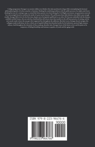 College programmer Stranger is an anxiety-ridden over-thinker who takes psychoactive drugs while contemplating the heretical philosophical gambit of techno-anarchy to Satanism. Masking this underlying nerdiness with the public persona of an alpha-male heavy drinking frat star, he's coming to age as a mixed kid whose parents were born during the Civil Rights movement; one generation removed, he is increasingly forced to confront the myths of a post-racial America. Oh, and because these daily identity crises didn't cause enough trouble, Stranger falls in love for the first time, despite never having had a girlfriend or sex sober. He's become enthralled with the demure, soulfully morbid Gunny, who not only has a boyfriend but self-esteem issues that manifest in the self-harm practice of cutting, and she isn't exactly ready to leave the one guy who's supported her throughout the addiction. But don't worry, Stranger doesn't navigate this collegiate underworld alone, he has a whole cast of equally brilliant but disturbed misfits for his hedonistic, poetical high-romance odyssey. And throughout the chronicles of these madcap, absurdist tales, Stranger learns of the limits to love and the pains to be temporary, of failing friendships and intimate escapades, of youth and the aging world.