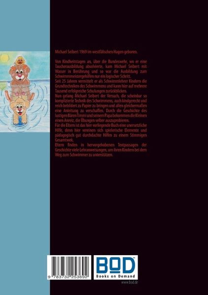 Michael Seibert 1969 im westfälischen Hagen geboren.Von Kindheitstagen an, über die Bundeswehr, wo er eine Taucherausbildung absolvierte, kam Michael Seibert mit Wasser in Berührung und so war die Ausbildung zum Schwimmmeistergehilfen nur ein logischer Schritt.Seit 25 Jahren vermittelt er als Schwimmlehrer Kindern die Grundtechniken des Schwimmens und kann hier auf mehrere Tausend erfolgreiche Schulungen zurückblicken.Die Kunst in der kindlichen Schwimmschulung ist normalerweise die individuelle Betreuung der einzelnen Kinder.Nun gelang Michael Seibert der Versuch, die scheinbar so komplizierte Technik des Schwimmens, auch kindgerecht und reich bebildert zu Papier zu bringen und allen gleichermaßen eine Anleitung zu verschaffen. Durch die Geschichte des lustigen Bären und seinem Vater bekommen die Kleinen einen Anreiz, die Übungen selber auszuprobieren.Für Eltern ist das hier vorliegende Buch eine unersetzliche Hilfe, denn hier vereinen sich spielerische Elemente und pädagogisch gut durchdachte Hilfen zu einem stimmigen Gesamtwerk.Eltern finden in hervorgehobenen Textpassagen der Geschichte viele Lehranweisungen, um ihre Kinder bei dem Weg zum Schwimmer zu unterstützen.