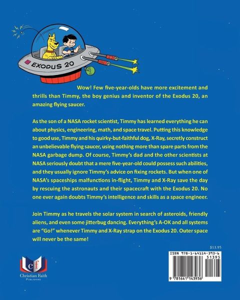 Wow! Few five-year-olds have more excitement and thrills than Timmy, the boy genius and inventor of the Exodus 20, an amazing flying saucer. As the son of a NASA rocket scientist, Timmy has learned everything he can about physics, engineering, math, and space travel. Putting this knowledge to good use, Timmy and his quirky-but-faithful dog, X-Ray, secretly construct an unbelievable flying saucer, using nothing more than spare parts from the NASA garbage dump. Of course, Timmy's dad and the other scientists at NASA seriously doubt that a mere five-year-old could possess such abilities, and they usually ignore Timmy's advice on fixing rockets. But when one of NASA's spaceships malfunctions in-flight, Timmy and X-Ray save the day by rescuing the astronauts and their spacecraft with the Exodus 20. No one ever again doubts Timmy's intelligence and skills as a space engineer. Join Timmy as he travels the solar system in search of asteroids, friendly aliens, and even some jitterbug dancing. Everything's A-OK and all systems are "Go!" whenever Timmy and X-Ray strap on the Exodus 20. Outer space will never be the same!