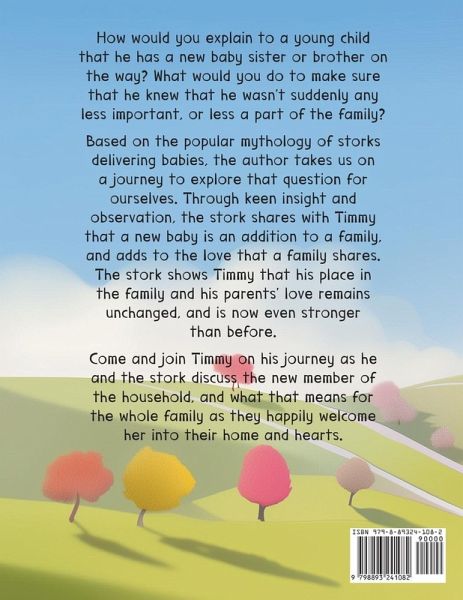 How would you explain to a young child that he has a new baby sister or brother on the way? What would you do to make sure that he knew that he wasn't suddenly any less important, or less a part of the family? Based on the popular mythology of storks delivering babies, the author takes us on a journey to explore that question for ourselves. Through keen insight and observation, the stork shares with Timmy that a new baby is an addition to a family and adds to the love that a family shares. The stork shows Timmy that his place in the family and his parent's love remains unchanged, and is now even stronger than before. Come and join Timmy on his journey as he and the stork discuss the new member of the household, and what that means for the whole family, as they happily welcome her into their home and hearts.