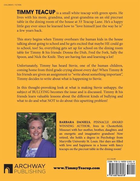 TIMMY TEACUP is a small white teacup with green spots. He lives with his mom, grandma, and great-grandma on an old piecrust table in the dining room of the house at 33 Teacup Lane. He's a happy little guy ever since he learned how to "love himself just the way he is" a few years back. This story begins when Timmy overhears the human kids in the house talking about going to school and he gets excited that maybe HE could go to school, too! So, everything gets set up for school on the dining room table for Timmy & his friends: Donna the Dish, Fred the Fork, Sally the Spoon, and Nick the Knife. They are having fun and learning a lot! Unfortunately, Timmy has heard Stevie, one of the human children, coming home from third grade crying almost every day! When Timmy & his friends are given an assignment to "write about something important", Timmy decides to write about what is happening to Stevie. In this thought-provoking look at what is making Stevie unhappy, the subject of BULLYING becomes the issue and is discussed. Timmy & his friends learn valuable lessons about the different kinds of bullying and what to do and what NOT to do about this upsetting problem!