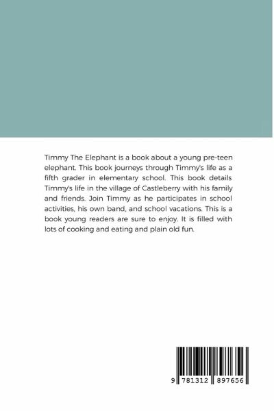 Timmy The Elephant is a book about a young pre-teen elephant. This book journeys through Timmy's life as a fifth grader in elementary school. This book details Timmy's life in the village of Castleberry with his family and friends. Join Timmy as he participates in school activities, his own band, and school vacations. This is a book young readers are sure to enjoy. There is lots of cooking and eating and plain old fun.