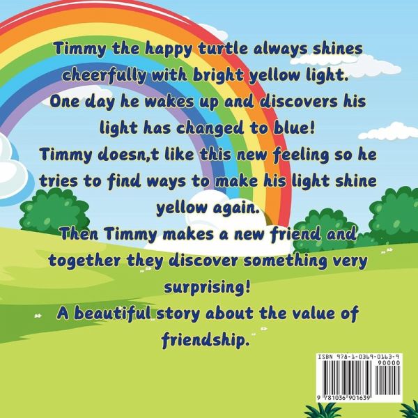 Reading age 4-8 Print length 42 pages Dimensions 8.5 x 8.5 inch A beautiful colourful picture book for children that teaches about the value of friendship and finding inner happiness. Timmy the happy turtle always shines cheerfully with bright yellow light. One day he wakes up to discover his light has changed blue. Timmy does not like this new feeling and spends the day trying to find ways to change his light back to yellow. Then Timmy makes a new friend and together they discover something very surprising! This is a must have for any child's book collection. It is a story that you will want to read again and again. A story to be cherished with your little ones! I am on a mission to keep the magic off reading alive! There is nothing better than curling up under a blanket with your child and a captivating story!. My books teach emotional self regulation and social skills, something I am very passionate about. My books are based on my own lived experience with autism and special needs as I am proud mum to a very special boy. I draw on my passion to help him and other children to manage difficult emotions. Having also worked as a teaching assistant at a special needs school , my books are widely used in the classroom by teachers and professionals. Make reading time tonight special by meeting Timmy the turtle and help him to find his happy shine again!