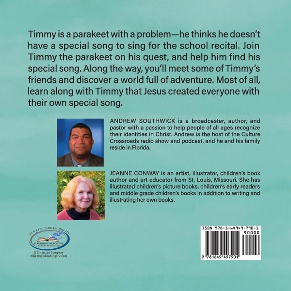 Timmy is a parakeet with a problem-he thinks he doesn't have a special song to sing for the school recital. Join Timmy the parakeet on his quest, and help him find his special song. Along the way, you'll meet some of Timmy's friends and discover a world full of adventure. Most of all, learn along with Timmy that Jesus created everyone with their own special song.
