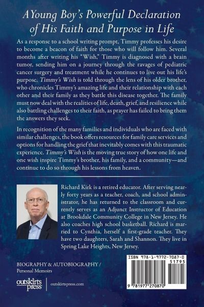 Timmy's Wish is a young boy's powerful declaration of his faith and purpose in life. Composed in response to a school writing prompt, he proclaims his desire to become a beacon of faith for those who will follow him. Several months after writing his 'Wish', Timmy is diagnosed with a brain tumor, and this sends him on a journey through the ravages of pediatric cancer surgery and treatment while he continues to live out his life's purpose. Timmy's Wish is told through the experiences of his older brother who chronicles his younger brother's amazing life and their relationship with each other and their family as they battle this disease together. The family, without warning, must now deal with the realities of life, death, grief, and resilience while also battling the challenge to their faith as prayer has failed to bring them the answers they seek. In recognition of the many families who are faced with similar challenges, there are resources listed for families and individuals who seek family care services and options for managing the grief that inevitably comes with this traumatic experience. Timmy's Wish is the moving true story of how one life and one wish inspires his brother, his family, and a community and continues to do so through his lessons from heaven.