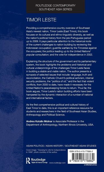 This book provides a comprehensive country overview of Southeast Asia's newest nation, Timor Leste (East Timor). This book focuses on its cultural and ethno-linguistic diversity, and its political history from the pre-Portuguese period up to 2009. The book pays particular attention to the historical roots of the current challenges to nation-building by reviewing the Indonesian occupation; guerrilla warfare by the Timorese against the occupiers; the politics leading up to the United Nations' popular consultation and the vote for independence in 2002. Explaining the structure of the government and its parliamentary system, this book highlights the problems and historical and cultural underpinnings of the challenges Timor Leste faces in building a stable viable nation. The author presents a synopsis of selected issues including: language, truth and reconciliation, the Catholic Church's political activism, internal security problems, the 'politics of oil', and the fact that violent conflicts, from 2005 to date, have made it necessary for the United Nation's peacekeeping forces to return. Thus far, the book argues, Timor Leste's nation-building efforts have been hampered by the dynamic interaction of number of national and international factors. The first comprehensive political and cultural history of East Timor to date, this book fills a gap and will be an important single reference resource for students and researchers in the field of Southeast Asian Studies, Anthropology and Political Science.